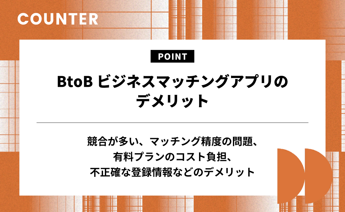 BtoBビジネスマッチングアプリは便利なツールですが、導入前に理解しておくべきデメリットも存在します。まず、多くの企業が同じプラットフォームを利用するため、競合が激しく差別化が難しい点です。