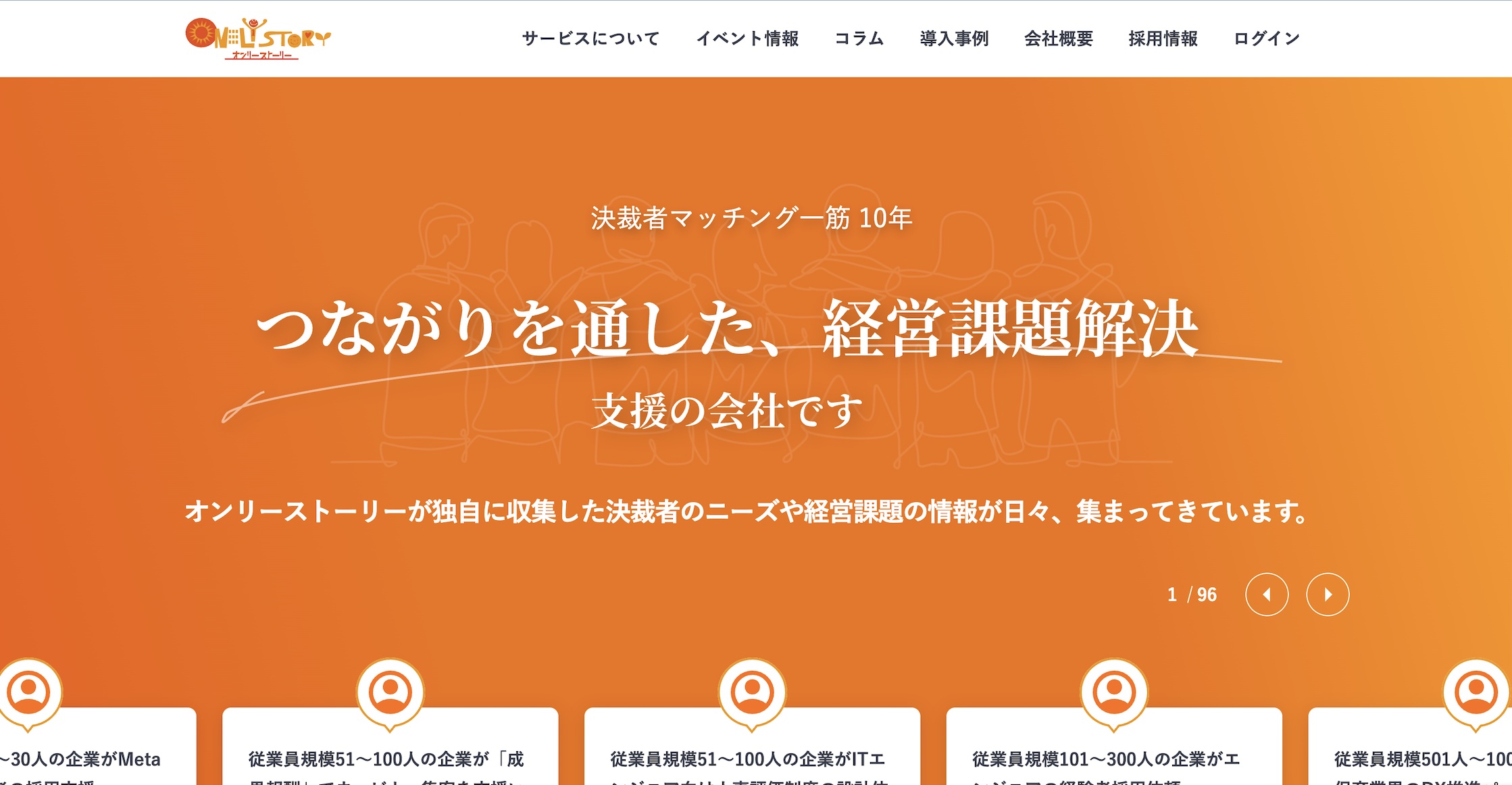 オンリーストーリーは、中小企業やスタートアップに特化したBtoBビジネスマッチングサイトです。企業の理念やビジョンといった「ストーリー」を重視し、単なる取引先紹介にとどまらず、共感や信頼を基盤にした関係構築を可能にしています。