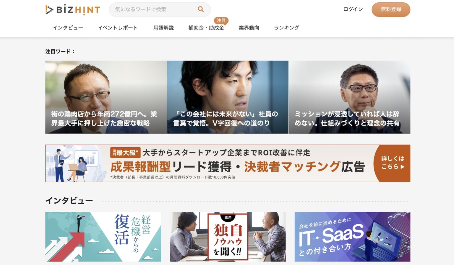 BtoB企業のオウンドメディア成功事例として挙げられるのが、株式会社ビズヒントが運営する「BizHint」です。BizHintは、経営者やビジネスパーソン向けに、経営に役立つ情報を提供するメディアとして知られています。特に、経営戦略やマーケティング、人材育成など、幅広いテーマを扱い、専門家のコラムや事例紹介が豊富です。