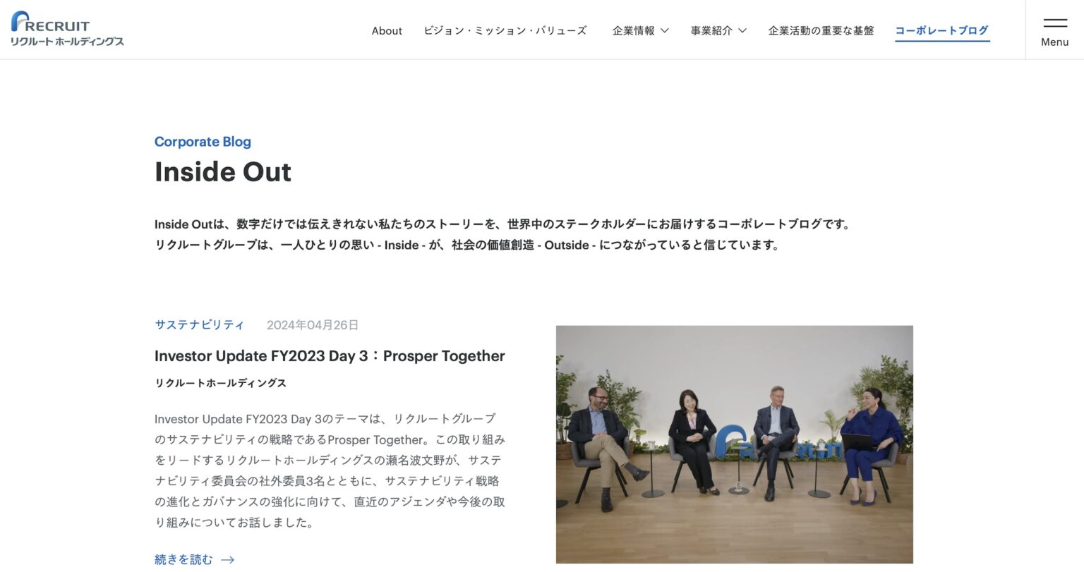 リクルートホールディングスが運営するオウンドメディア「Inside Out」は、同社の企業文化や働き方、事業戦略に関する深い洞察を提供しています。